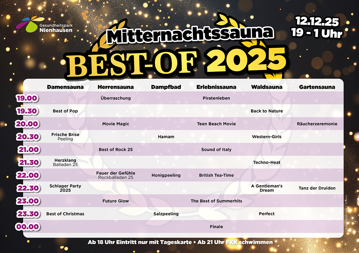 Erlebt unser romantisches Sauna-Special für Paare: Die Saunalandschaft wird zum stimmungsvollen FKK-Bereich im warmen Kerzenlicht. Freut Euch auf besondere Aufgüsse, wohltuende Sole und textilfreies Schwimmen in einzigartiger Atmosphäre. Der Abend startet mit einem prickelnden Sektempfang und wird durch ein genussvolles Buffet abgerundet. Ein romantisches Highlight für Paare, die eine gemeinsame Auszeit erleben möchten.