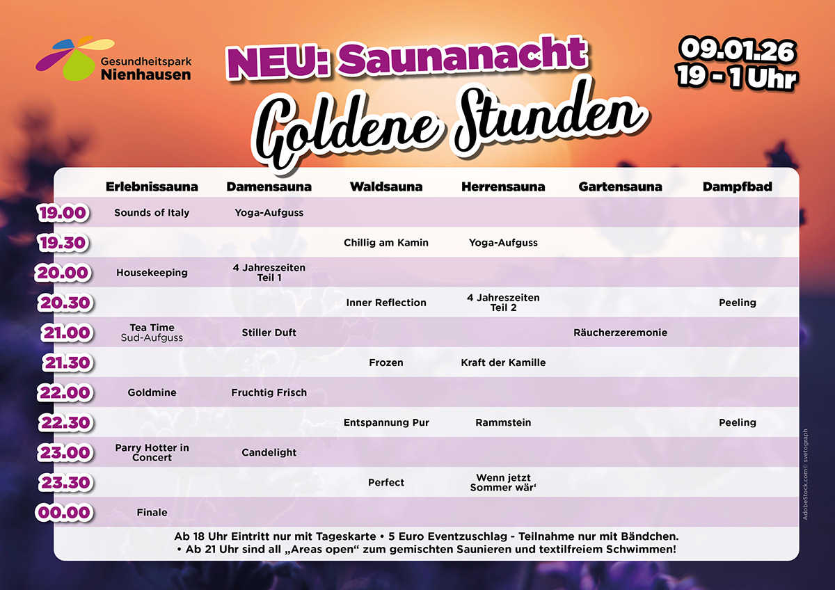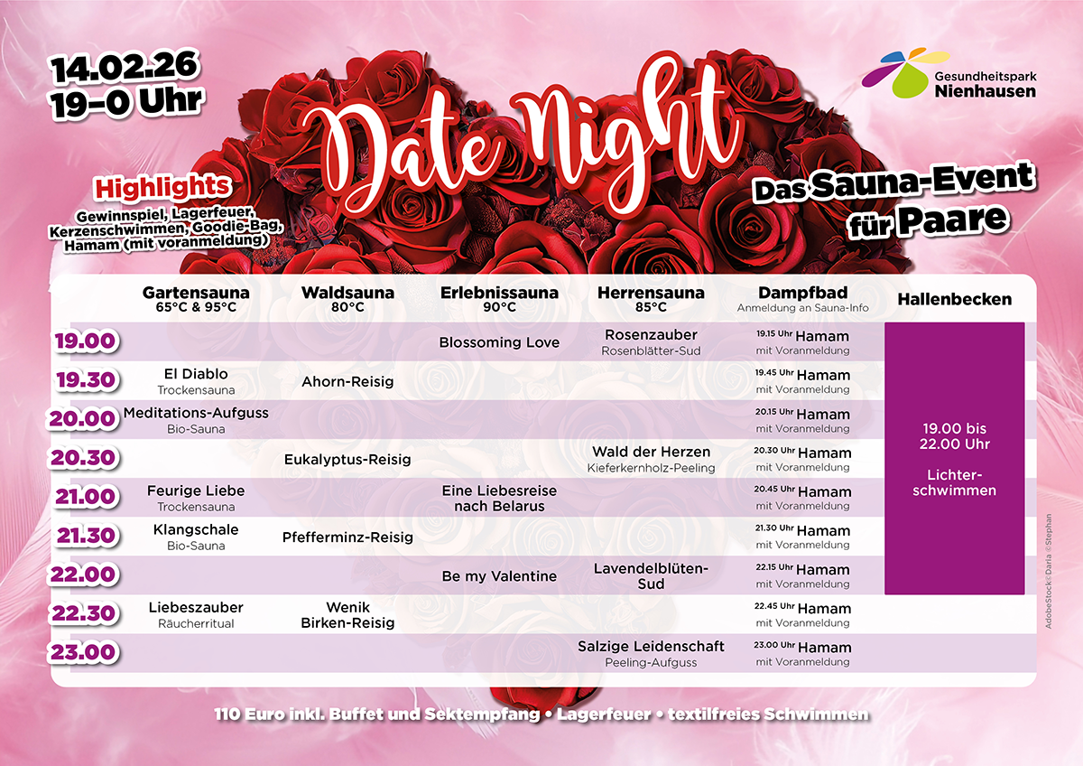 Erlebt unser romantisches Sauna-Special für Paare: Die Saunalandschaft wird zum stimmungsvollen FKK-Bereich im warmen Kerzenlicht. Freut Euch auf besondere Aufgüsse, wohltuende Sole und textilfreies Schwimmen in einzigartiger Atmosphäre. Der Abend startet mit einem prickelnden Sektempfang und wird durch ein genussvolles Buffet abgerundet. Ein romantisches Highlight für Paare, die eine gemeinsame Auszeit erleben möchten.