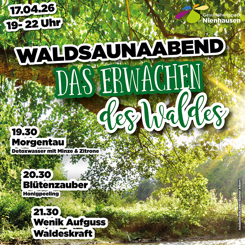 Eine richtige Institution sind die beliebten Waldsaunaabende bei Saunafans geworden. Jeden Monat neu inspiriert mit den beliebten Wenik Aufgüssen. Immer von 19.00-22.00 Uhr zum regulären Eintrittspreis.